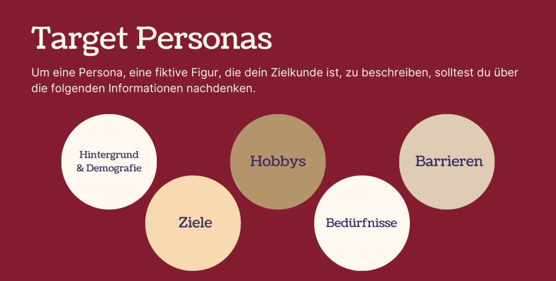 Das Erstellen einer oder mehrerer Personas dient dazu den Zielkunden zu visualiseren und zu personalisieren. Eine Persona fasst die wichtigsten Eigenschaften des Zielkunden zusammen. Gebe deiner Persona einen beschreibenden Namen und füge ein Bild hinzu, wie sie aussehen könnte. Das hilft um sich ein richtiges Bild davon zu machen, wer dein Zielkunde ist.