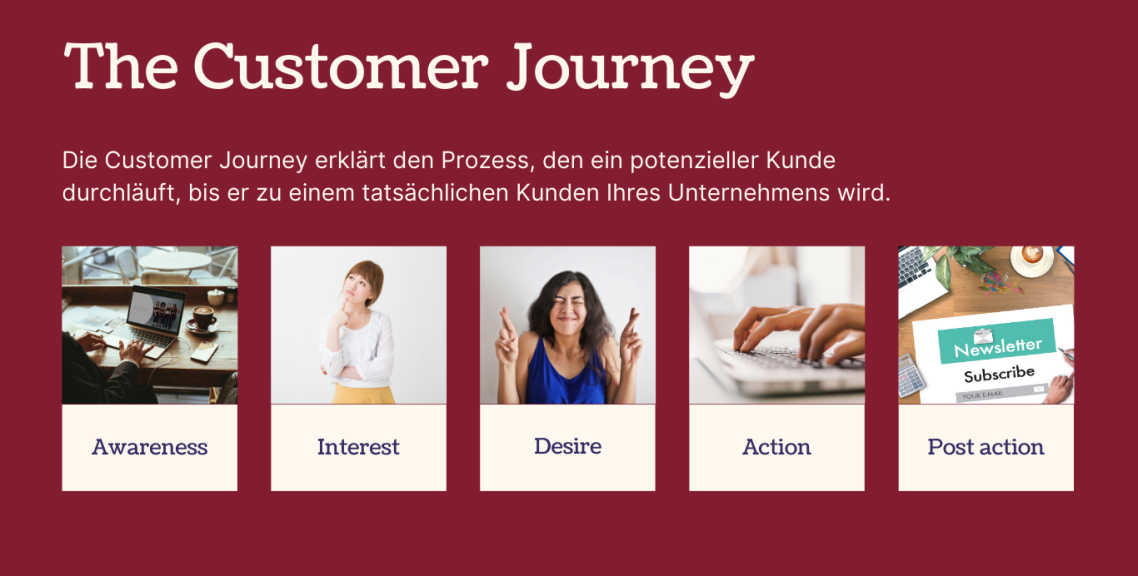 Die Customer Journey beschreibt den Weg, den potenzielle Kunden von der ersten Aufmerksamkeit bis zur Kaufentscheidung durchlaufen. Sie hilft dabei zu verstehen, an welchen Berührungspunkten Menschen mit einer Marke in Kontakt kommen und wie Marketingmaßnahmen gezielt darauf abgestimmt werden können. Kunden können auf viele verschiedene Arten von Ihrem Unternehmen erfahren. Die meisten Kunden durchlaufen die einzelnen Schritte nicht der Reihe nach. Sie springen hin und her.